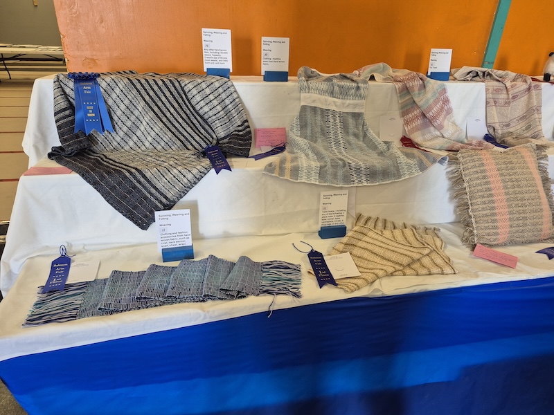The Oregon State Fair, located in Salem, Oregon, is a significant community event for the Salem Fiberarts Guild, and 2025 was no different. SFG members were at the Fiber Arts area of the Fair each day during the two-week event, demonstrating weaving, spinning, and other fiber activities. This year, we were excited to be joined by members of five other area guilds. Thanks to Weaving Guilds of Oregon (WeGO) for organizing the Fiber Arts, from judging to displays to exhibitions to Make-and-Takes. SFG is excited for the 2026 Fair!
